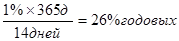 18.3 РАСЧЕТ ГОДОВЫХ СТАВОК ПРОЦЕНТА Очевидно, что при одинаковых условиях (одинаковый срок, простой или сложный процент) выгоднее та инвестиция, у которой выше пропет н.1я ставка. Однако зачастую сроки инвестиций и периоды вычла I по ним не совпадают. В этом случае для того. чтобы сравнивать инвестиции, необходимо рассчитывать их процентные ставки, приведенные к одному и тому же временному периоду. Как правило. в качестве такого периода выбирается год. Пример 3 Сравнить, какой из банковских вкладов выгоднее: а) вложение 1000 рублей в банк на месяц под 3% в месяц; б) вложение 500 рублей в банк на 6 месяцев под 12% за полгода. Можно вычислить, каков доход в процентном выражении за месяц во втором случае, и сравнить с уже данным показателем в первом случае. Однако традиционно в качестве такого периода берется один год. При этом говорят, что ставка составляет Х процентов годовых. Вычисление ставки в годовом исчислении можно производить по формуле простого или сложного процента. Пример 4 По банковскому вкладу ежеквартально начисляют 2% от первоначальной суммы вклада. Найти годовую ставку процента. Процентную ставку в периоде начисления умножают на число перио-дов в году: Годовая ставка процента = r х n = 2 % х 4 квартала = 8% годовых Пример 5 Вклад в банке дает 1% за 14 дней. Найти годовую ставку процента. Годовая ставка процента