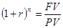 Где FV — будущая стоимость, PV — текущая стоимость (первоначальная стоимость на момент инвестирования = основная сумма вклада при первоначальном инвестировании), r — ставка процента в периоде начисления в долях единицы, n — число периодов начисления. В случае одного периода (п = 1) формулы (3) и (4) совпадают, т, к. в случае одного временного интервала реинвестирования не происходит и условия заимствования фактически совпадают.