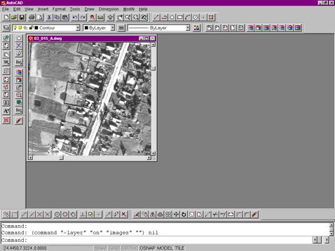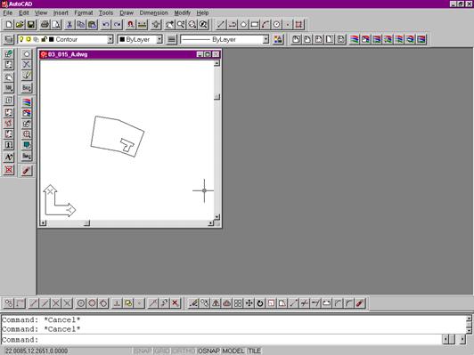 Сначала прокладывается опорный теодолитный ход по измеренным внутренним углам и горизонтальным проложениям. Углы и проложения вписываются в командную строку, которая распологается в нижней части окна программы. Потом на основе этого теодолитного хода накладывается ситуация. По промерам и полярным углам от точки и базовой линии вырисовываются точки ситуации. Следующим действием является соединение точек ситуации, для получения ситуации (зданий, дорог и т.д.) и границ земельного участка. Созданый план накладывается на фотоплан соответствующей зоны, который в оцифрованном виде храницся на диске и связан с программой. На этом фотоплане производится привязка плана к характкрным точкам ситуации и к координатам по существующим на фотоплане опознакам, которые имеются в каталоге координат Ярославского района, Ярославской области.