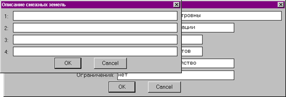 В этом окне вписывается описание смежных земель, фамилии землепользователей или название юридических лиц.