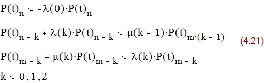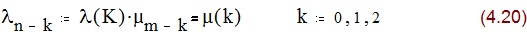 Вероятность перехода из состояния n-k в состояние m-k есть ln-kt для k = 0,1,2, . . . . Соответственно вероятность перехода из состояния m-k в состояние n-k-1 будет mm – nt для k = 0,1,2 . . . . .