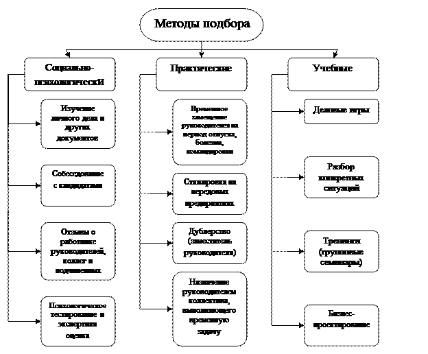 Применяются также и практические методы: назначение кандидата руководителем коллектива, выполняющего временную задачу; замещение отсутствующего руководителя на время его командировки, болезни, отпуска; стажировка, дублерство и др. Методы подбора кандидатов в резерв показаны на рис. 1.