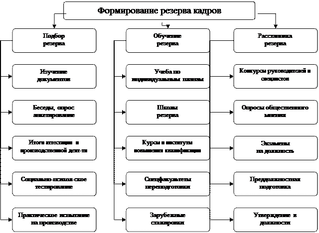 Отдел управления персоналом играет важную организующую и координирующую роль в подготовке кадрового резерва. Однако повышение профессиональной подготовки кадров и подготовка резерва – является важнейшим направлением деятельности прежде всего руководителей всех уровней управления.[3]