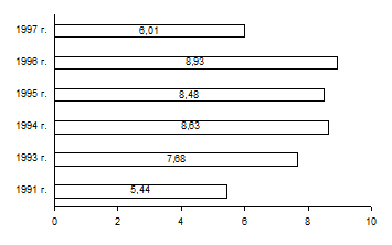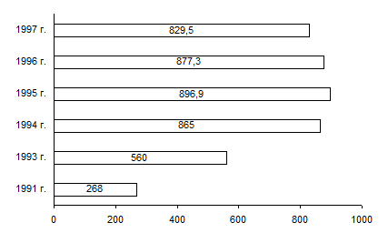 К началу 1996 г. было приватизировано 125,4 тыс. предприятий. Негосударственным сектором экономики производится около 70% ВВП.1 Но ни одна из первых шести поставленных программой приватизации целей не была достигнута. Среди них структурная перестройка даже не предусматривалась. Зато в соответствии с односторонними представлениями о монополизме допущена возможность создания крупных финансово-промышленных структур, ставших основой экономики развитых стран и способных решить ряд насущных задач построения смешанной экономики в России.