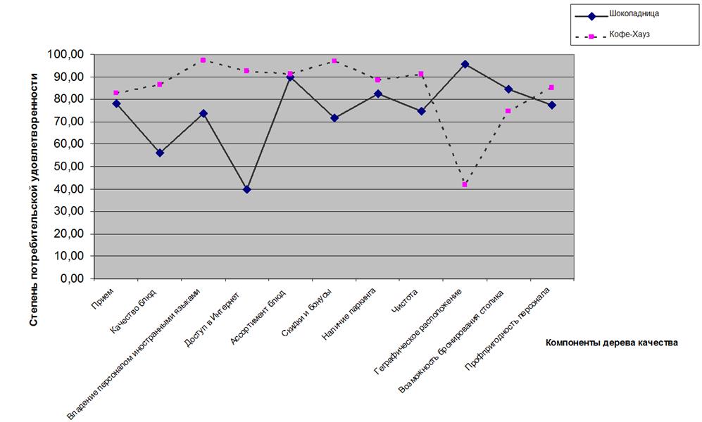 7. Индексация степени удовлетворенности потребителя позволяет количественно оценить вклад различных составляющих качества (компонентов дерева) в общее мнение потребителя о качестве исследуемого объекта. Для сравнения степени удовлетворенности потребителем качества обслуживания было проведено исследование потребительской удовлетворенности в кофейни “Кофе Хауз”. Кофейни “Кофе Хауз” является одним из самых серьезных конкурентов кофейни “Шоколадница” по ценовому сегменту рынка. Анализируя карту можно сделать вывод о том, что главными конкурентными преимуществами кофейни “Кофе Хауз” перед кофейней “Шоколадницы” являются наличие собственной парковки и организованного доступа в Интернет. Главным же достоинством кофеен “Шоколадница” является их удобное географическое расположение. Однако опрошенные клиенты кофейни “Кофе Хауз” придают невысокий удельный вес такому компоненту дерева, как удаленность от центра, всего 3,5 балла, что позволяет сделать вывод о том, что для них географическое расположение кофейни не является фактором, формирующим выбор. Для того чтобы переманить этих клиентов в свои кофейни “Шоколадница” следует разработать стратегию привлечения клиентов не удобным расположением, а уровнем качества предоставляемых блюд и их разнообразием. В среднем же оценки качества обслуживания в кофейнях-конкурентах различаются в половину балла, или на 10 процентов.