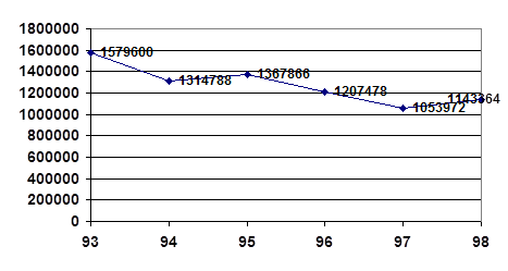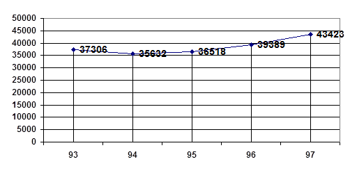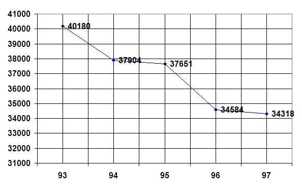 Так удельный вес краж в общем количестве всех зарегистрированных преступлений составил: в 1994 г.-49,9%; в 1995 г. - 49,6 %, в 1996 г. – 45,9%; в 1997 г. – 49,3%; в 1998 г. – 44,2% Так по степени распространенности кражи можно разделить на: 1) квартирные с проникновением в жилище (25,2% от общего числа краж, и 11,2% от общего числа зарегистрированных преступлений на 1997 г.) 2) уличные 3) автотранспорта 4) карманные 5) на транспорте 6) скота в сельской местности 7) у совместно проживающих лиц в общежитиях, гостиницах, пансионатах, домах отдыха. Кражи личного имущества на улицах составляют около 40% всей уличной преступности. Возрастает число краж транспортных средств, темпы прироста за два года (1996,1997 гг.) составили 80%, удельный вес в общем числе уличных преступлений около 9%. Кражи квартирные, карманные совершаются преимущественно /до 80%/ в дневное время. Анализ же преступлений, связанных с кражами, разукомплектованиями, угонами автомототранспорта в крупных городах показал, что 85% из них совершаются в вечернее и ночное время в непосредственной близости от жилых домов пострадавших. Способы совершения краж, с одной стороны, остаются традиционными: вхождение в доверие, подбор ключей, использование отмычек и другого воровского инструмента, проникновение через форточки, открытые окна, чердаки, двери балконов, разрезание карманов и дамских сумочек, а с другой – приобретают черты агрессивности: взлом дверей, срывание замков и запоров, проломы стен и потолочных покрытий, а в сельской местности – разбор печных труб. Аналогична картина с разбоями и грабежами, которые в структуре преступности составляют в последние годы примерно 6,1%/4,7% грабежи и около 1,4% разбои. Они также совершаются в большинстве своем в городах и поселках городского типа (≈80,6% по данным на 1997 г. разбоев и ≈84,2% грабежей). В отличии от кражи, грабеж- открытое хищение чужого имущества. Закон считает открытое хищение чужого имущества более опасным, чем тайное. Как правило, открытые преступные действия носят более дерзкий характер по сравнению с тайным. Преступник при грабеже идет на риск быть задержанным. Он нередко бывает психологически подготовлен даже к возможности использовать насилие в целях завладения имуществом. Темпы прироста (снижения) грабежа в период с 1993 по 1997 гг. схематически выглядит так: