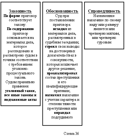 Таким образом, приговор представляет собой правоприменительный акт, в котором суд (судья) в пределах своей компетенции и в предусмотренном законом порядке делает вывод об установленных фактических обстоятельствах и на основе этих обстоятельств и закона дает ответы на правовые вопросы и выражает властное волеизъявление о действиях, вытекающих из установленных обстоятельств и предписаний закона. Принцип презумпции невиновности, закрепленный в ст. 49 Конституции РФ и ст. 14 УПК РФ, гласит, что каждый обвиняемый в совершении преступления считается невиновным, пока его виновность не будет доказана в предусмотренном федеральным законом порядке и установлена вступившим в законную силу приговором суда. Приговор выносится судом (судьей) от имени государства, именем Российской Федерации и только на основании доказательств, исследованных в ходе судебного разбирательства и признанных им допустимыми. Уголовно-процессуальный закон предъявляет к приговору ряд требований. Так в ст. 297 УПК указано, что приговор суда должен быть законным, обоснованным и справедливым, т.е. постановленным с соблюдением порядка, установленного УПК РФ, и основан на правильном применении уголовного закона (схема 36). Законность приговора означает, что производство по установлению обстоятельств уголовного дела осуществлено во всех стадиях процесса компетентными органами и лицами в соответствии с уголовно – процессуальным законом. Приговор постановлен законным составом суда. Его содержание, форма, порядок и условия вынесения отвечают требованиям норм УПК. Обоснованность приговора означает, что суд при его постановлении: исходил из материалов дела, рассмотренных в судебном заседании; строил свои выводы на достоверных доказательствах в совокупности, которая исключает другое решение, кроме принятого судом; глубоко проанализировал состав преступления и его квалифицирующие признаки; в случае признания лица виновным назначил наказание с учетом характера и степени тяжести преступления, личности виновного и степени тяжести преступления, личности виновного и обстоятельств дела, смягчающих и отягчающих наказание; в случае признания подсудимого невиновным – оправдал его. Справедливость приговора – его оценка как с правовой, так и с нравственной стороны, т.е. уголовное дело рассмотрено объективно и беспристрастно, права подсудимого реально обеспечены, вынесено законное и обоснованное решение, назначено справедливое наказание. Конституционное положение о том, что каждый обвиняемый в совершении преступления считается невиновным, пока его виновность не будет доказана в предусмотренном федеральным законом порядке и установлена вступившим в законную силу приговором суда, определяет значение судебного приговора как важнейшего акта правосудия и обязывает суды неукоснительно соблюдать требования законодательства, предъявляемые к приговору. Согласно ст. 298 УПК РФ, приговор постановляется судом в совещательной комнате. Во время постановления приговора в этой комнате могут находиться лишь судьи, входящие в состав суда по данному уголовному делу. По окончании рабочего времени, а также в течение рабочего дня, суд вправе сделать перерыв для отдыха с выходом из совещательной комнаты. Судьи не вправе разглашать суждения, имевшие место при обсуждении и пост