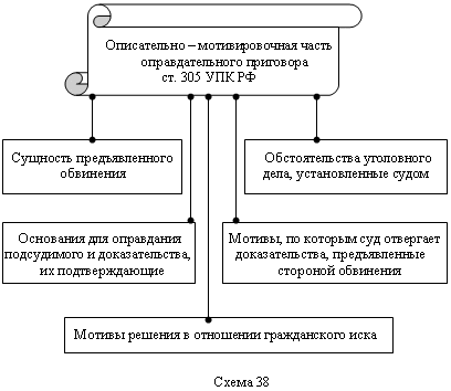 К иным сведениям о личности подсудимого, имеющим значение для дела, относятся такие сведения, которые наряду с другими данными могут быть учтены судом при назначении наказания, определении вида исправительной или воспитательной колонии, признании подсудимого особо опасным рецидивистом и разрешении других вопросов, связанных с постановлением приговора. Это, в частности, данные об имеющейся у подсудимого инвалидности, наличии у него государственных наград, почетных, воинских и иных званий, о прежних судимостях. При этом в отношении лиц, ранее судимых, в вводной части приговора должны содержаться сведения о времени осуждения, уголовном законе, мере наказания, содержании в местах лишения свободы, основании и времени освобождения, неотбытой части наказания по предыдущему приговору. Если судимости сняты или погашены, суд не вправе указывать их в вводной части приговора. В таких случаях, когда это имеет значение для назначения вида исправительно-трудового учреждения лицу, осужденному к лишению свободы, суд в описательной части приговора указывает, что подсудимый ранее отбывал наказание в виде лишения свободы. В соответствии со ст. 305 УПК РФ, в описательно-мотивировочной части оправдательного приговора излагаются (схема 38): 1) сущность предъявленного обвинения; 2) обстоятельства уголовного дела, установленные судом; 3) основания для оправдания подсудимого и доказательства, их подтверждающие; 4) мотивы, по которым суд отвергает доказательства, представленные стороной обвинения; 5)мотивы решения в отношении гражданского иска. В описательной части приговора должно быть также отражено отношение подсудимого к предъявленному обвинению и дана оценка доводам, приведенным им в свою защиту. В случае изменения подсудимым показаний, данных им при производстве дознания или предварительного следствия, суд обязан тщательно проверить те и другие его показания, выяснить причины изменения показаний и дать им оценку в совокупности с иными собранными по делу доказательствами. Отказ подсудимого от дачи показаний не может служить подтверждением доказанности его вины и учитываться в качестве обстоятельства, отрицательно характеризующего личность подсудимого, при назначении ему вида и размера наказания. Суд не должен допускать в приговоре формулировок, свидетельствующих о виновности в совершении преступления других лиц, т.к. разбирательство дела в суде производится только в отношении подсудимых. В тех случаях, когда отдельные участники преступного деяния, в совершении которого обвиняется подсудимый, освобождены от уголовной ответственности по предусмотренным в законе основаниям, суд, если это имеет значение для установления роли, степени и характера участия подсудимого в преступлении, квалификации его действий или установления других существенных обстоятельств дела, может сослаться в приговоре на роль этих лиц в деянии с обязательным указанием оснований прекращения дела.