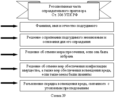 Если дело в отношении некоторых обвиняемых выделено в отдельное производство, в приговоре указывается, что преступление совершено подсудимым совместно с другими лицами, без упоминания их фамилий. В приговоре необходимо мотивировать выводы суда относительно квалификации преступления по той или иной статье уголовного закона, его части либо пункту. Признавая подсудимого виновным в совершении преступления по признакам, относящимся к оценочным категориям (тяжкие или особо тяжкие последствия, крупный или значительный ущерб, существенный вред, ответственное должностное положение подсудимого и другие), суд не должен ограничиваться ссылкой на соответствующий признак, а обязан привести в описательной части приговора обстоятельства, послужившие основанием для вывода о наличии в содеянном указанного признака. По делу в отношении нескольких подсудимых или по делу, по которому подсудимый обвиняется в совершении нескольких преступлений, суд должен обосновать квалификацию в отношении каждого подсудимого и в отношении каждого преступления. Суд вправе изменить обвинение и квалифицировать действия подсудимого по другой статье уголовного закона, а равно квалифицировать отдельные эпизоды преступления по статье закона, по которой подсудимому не было предъявлено обвинение лишь при условии, если действия подсудимого, квалифицируемые по новой статье закона, вменялись ему в вину и не были исключены судьей из обвинительного заключения при назначении судебного заседания, не содержат признаков более тяжкого преступления и существенно не отличаются по фактическим обстоятельствам от обвинения, по которому дело принято к производству суда, а изменение обвинения не ухудшает положения подсудимого и не нарушает его права на защиту. Уголовно-процессуальный закон категорически запрещает включение в оправдательный приговор формулировок, ставящих под сомнение невиновность оправданного. В резолютивной части оправдательного приговора должны содержаться (см. схему 39): 1) фамилия, имя и отчество подсудимого; 2) решение о признании подсудимого невиновным и основания его оправдания; 3) решение об отмене меры пресечения, если она была избрана; 4) решение об отмене мер обеспечения конфискации имущества, а также мер обеспечения возмещения вреда, если такие меры были приняты; 5) разъяснение порядка возмещения вреда, предусмотренного главой 18 УПК РФ, связанного с уголовным преследованием (ст. 306 УПК). При постановлении оправдательного приговора, вынесении постановления или определения о прекращении уголовного дела по основаниям отсутствия события преступления, а также непричастности подсудимого к совершению преступления суд отказывает в удовлетворении гражданского иска. В остальных случаях суд оставляет гражданский иск без рассмотрения. Оставление судом гражданского иска без рассмотрения не препятствует последующему его предъявлению и рассмотрению в порядке гражданского судопроизводства. В соответствии со ст. 307 УПК РФ, описательно-мотивировочная часть обвинительного приговора должна содержать: 1) описание преступного деяния, признанного судом доказанным, с указанием места, времени, способа его совершения, формы вины, мотивов, целей и последствий преступления; 2) доказательства, на которых основаны выводы суда в отношении подсудимого, и