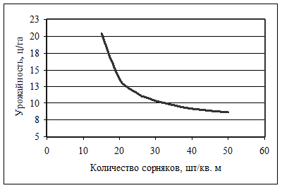 урожайность резко снижается с 17,5 до 11 ц/га. Затем кривая выравнивается, но все еще сохраняется тенденция к снижению урожая. Математическая зависимость описывается кривой типа обратная экспонента, выраженная уравнением
