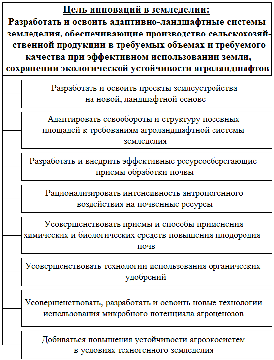 Рисунок 2 - Цель и задачи инновационной деятельности Во-вторых, развивая предыдущее направление, требуется адаптировать севообороты и структуру посевных площадей в хозяйствах к специфическим особенностям агроландшафтной системы земледелия[14] . В-третьих, необходимо разработать и внедрить в сельскохозяйственных предприятиях эффективные ресурсосберегающие приемы обработки почвы (энерго-, влаго-, трудо- и почвосберегающие технологии. В-четвертых, нужно, наконец, перейти к рационализации антропогенного возделывания на почвенные ресурсы. В-пятых, требуется усовершенствовать приемы и способы применения химических, а также биологических средств повышения плодородия почв, в частности на основе эффективного использования предварительно обогащенных азотными удобрениями пожнивных остатков, соломы, увеличения масштабов применения сидеральных паров. В-шестых, требуется усовершенствовать технологии использования органических удобрений, в большей мере способных предотвратить потери гумуса в почве и даже наращивать его содержание. В-седьмых, остается актуальной задача по усовершенствованию традиционных и разработке новых эффективных технологий использования микробного потенциала агроценозов, от чего плодородие почв зависит в не меньшей мере, чем от применения удобрений. В-восьмых, и, пожалуй, наиболее актуальное направление. Требуется изыскивать и осуществлять меры, обеспечивающие устойчивость агроэкосистем в условиях техногенного земледелия, которое, несомненно, еще длительное время будет оставаться преобладающим. Чтобы оценить результаты новых научных исследований рассматриваемых направлений, их целесообразно сравнить с традиционными техногенными системами земледелия (табл.9)[15] . Наиболее четко проследить различия между техногенной и адаптивной системами земледелия можно, опираясь на анализ, выполненный академиком А.А. Жученко. Как видно из помещенной в его работе таблицы (табл.9), радикальные отличия прослеживаются по всем 11 компонентам, формирующим рассматриваемые системы. Таблица 9 - Отличительные особенности традиционных (химико-техногенных) и адаптивно-ландшафтных систем земледелия (по А.А. Жученко, 2004 г.)