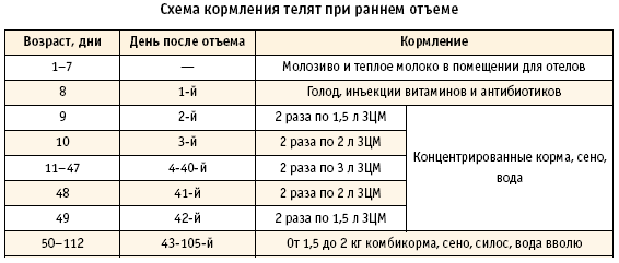 Первый раз поить телочку молозиво нужно сразу после появления на свет, потом — 3–4 раза в день в течение недели. В конце этого периода объем ежесуточно потребляемого молока не должен быть более 5 кг. Когда количество цельного молока ограничено, особенно в зимнее-стойловый период, молодняку обязательно дают витаминно-минеральные премиксы. Питательная мука для телят может быть двух видов: «грубая» для скармливания в сухом виде и «мягкая» (более тонкого помола) для приготовления болтушки (100 г муки на 10 л воды). В возрасте 10–12 недель молодняк охотно поедает такую кормовую смесь: по 20% дробленых пшеницы, овса, ячменя, кукурузы, 18% льняного жмыха, 2% премикса. Еще вариант смеси: 40% овса дробленого, 10 — молотой фасоли (гороха), 8 — соевого шрота, 30 — ячменя и кукурузы дробленых, 10 — льняного (подсолнечникового или соевого) жмыха, 2% премикса. Примерно с 12-й недели, когда количество молока в рационе сокращается, включают смеси с более высоким содержанием белка, например по 35% дробленого овса и ячменя, 20 — соевого шрота, 8 — льняного жмыха, 2% премикса. Или такой состав: по 30% дробленого овса и кукурузы, соевого шрота, 8 — рапсового шрота, 2% премикса. Еще один состав: по 33% дробленого овса и молотой фасоли, по 16% соевого шрота и льняного жмыха, 2% премикса. В смеси включают только доброкачественные компоненты. Кроме того, скармливают свежее луговое и хорошо облиственное сено с высоким содержанием питательных веществ и низким (220 г/кг) — сырой клетчатки. Чтобы облегчить телятам переход к нормальному для жвачных пищеварению и в то же время обеспечить полноценный рацион, до 10–12-недельного возраста им нужно давать концентрированных кормов больше, чем сена. Когда животные начинают поедать в сутки более 1 кг концентратов и 1 кг сена, можно считать, что дальнейший процесс выращивания пойдет нормально. Сергей КУЗНЕЦОВ Лев ЗАБОЛОТНОВ, доктора биологических наук Животноводство России №11-2007г. Преимущества и трудности раннего отъема Ранний отъем и выращивание телят на небольшом количестве цельного молока внедряли в животноводство в начале прошлого века. В последние десятилетия появились заменители молока, которые позволяют без ущерба для здоровья теленка сокращать в рационе количество цельного молока и получать более высокие привесы. Современный опыт раннего отъема отличается от старых методов главным образом двухразовым выпаиванием теленку по 3 кг ЗЦМ в сутки в течение семи недель. Уже со второй недели телят подкармливают концентратами и высококачественным сеном, а в три недели они уже начинают пережевывать жвачку.Ранний отъем имеет ряд преимуществ: снижаются расходы на корма, уменьшаются затраты труда, сводится к минимуму риск возникновения болезней пищеварительного тракта, так как быстрее формируется и активнее развивается рубец. Если в первые недели жизни суточные привесы составляют 400–600 г, то потом этот показатель увеличивается. В 16 недель телята раннего отъема на 10% отстают по весу от своих ровесников, получавших цельное молоко, но уже в шестимесячном возрасте догоняют их. Успех раннего отъема обеспечивают несколько обязательных условий. В первые дни жизни телятам надо давать достаточное количество молозива, а потом в течение нескольких дней — цельное молоко. Самый благоприятный возраст для отъема — 8–10 суток, на следующий день телятам делаю
