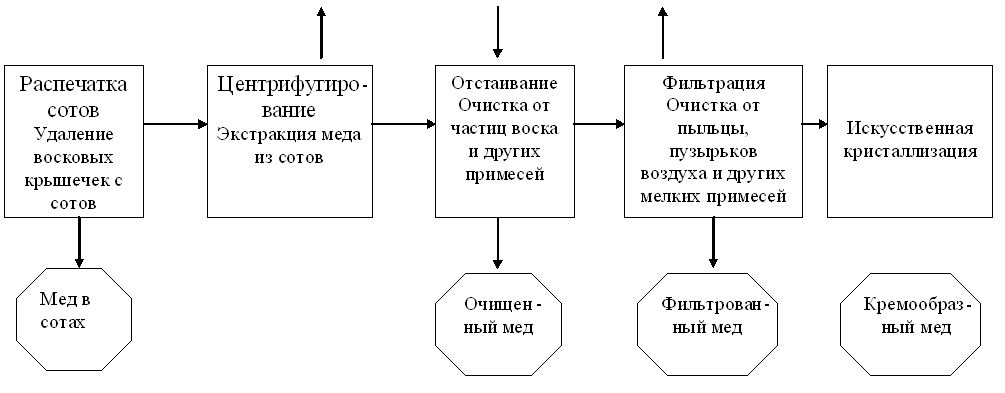 Все поверхности, руки и емкости, контактирующие с медом, должны быть стерильно чистыми. Обрабатывающие центры должны находиться вблизи источников чистой воды. Санитарное состояние помещений, в которых производится откачка меда, должно соответствовать санитарно-гигиеническим нормам. Емкости и перерабатывающее оборудование должны быть сделаны с учетом возможной кислотности продукции. Медь, железо и цинк растворяются под воздействием меда и могут повлиять на цвет, вкус и токсичность продукции. Для хранения и переработки медовой продукции следует использовать устойчивую к коррозии сталь, стекло, пластик для упаковки пищевых продуктов. Для недолгого хранения можно использовать цинк. Из сотов мед откачивают посредством медогонки. Ось, а вместе с ней и кассеты, приводится в движение ручным способом или с помощью электрического двигателя. Под влиянием центробежной силы мед вытекает из ячеек и по стене медогонки попадает на ее дно В зависимости от расположения кассет медогонки бывают двух видов хордиальные и радиальные. Радиальные медогонки обладают большей производительностью — в них можно сразу откачивать мед из 60 сотов. Время, необходимое для центрифугирования, зависит от сорта, вязкости, водности меда и от его температуры. Чтобы ускорить центрифугирование, откачку меда надо производить сразу же после извлечения из улья или отапливать помещение, где происходит откачка. 3. Очистка и фильтрование меда. Очищение от механических примесей, таких как частицы воска и пузырьки воздуха, которые попали в мед при центрифугировании. Производится двумя способами — отстаиванием и фильтрованием. Для отстаивания центрифугированный мед помещают в глубокий контейнер. В процессе отстаивания легкие частицы всплывают на поверхность, а минеральные и металлические частицы опускаются на дно. Затем осторожно снимают верхний слой, а мед переливают в другую посуду так, чтобы не потревожить осевшие на дне частицы. Скорость отстаивания зависит от размера частиц (отстаивание мелких частиц происходит дольше), размера контейнера и вязкости меда, то есть от содержания воды и температуры. При температуре 25-30 °С отстаивание обычно происходит довольно быстро и может занять всего несколько дней. Емкости должны быть плотно закрыты, чтобы избежать излишнего доступа воздуха. Последующее отстаивание освобождает мед от воздуха и пены. Если контейнеры достаточно большие, мед из разных пчелиных семей перемешивается, таким образом, достигается цельность готового продукта. Отстаивание особенно необходимо, если центрифугировался мед с влажностью выше 20 %. Снижение содержания воды можно ускорить, пропуская над отстойниками струю теплого воздуха и периодически помешивая мед, а также разливая мед в широкие и мелкие противни. Избыток воды можно устранить до центрифугирования, помещая мед в сотах в помещение, обогреваемое теплым воздухом с температурой 38 °С. Фильтрация может использоваться вместо или вместе с отстаиванием, для нее используются фильтры различной модификации. Высококачественная фильтрация получается при одновременной пастеризации (нагревании до 77-78 °С). Это позволяет удалить все мелкие частицы, включая пыльцу, что замедляет кристаллизацию на более длительный срок. Так как при нагревании разрушаются некоторые полезные вещества, этот мед 