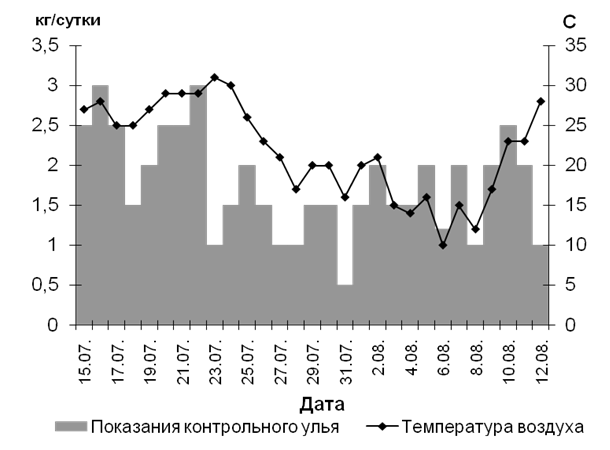 Таблица 2 – Показатели контрольного улья в зависимости от метеорологических условий за 2009 год