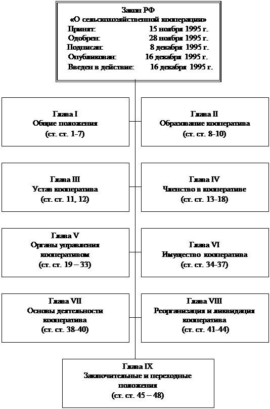 | ГЛАВА 4. ФЕДЕРАЛЬНЫЙ ЗАКОН ОТ 8 ДЕКАБРЯ 1995 Г. № 193 –ФЗ «О СЕЛЬСКОХОЗЯЙСТВЕННОЙ КООПЕРАЦИИ» I. Общие методические положения. Особенности создания и деятельности сельскохозяйственных кооперативов (производственных, перерабатывающих, обслуживающих сельскохозяйственных производителей) определяются Законом Российской Федерации «О сельскохозяйственной кооперации» (№ 193 – ФЗ от 8 декабря 1995 г.) Настоящий Федеральный закон гарантирует гражданам (физическим лицам) и юридическим лицам право на создание и государственную поддержку сельскохозяйственных кооперативов и их союзов (ассоциаций). Закон «О сельскохозяйственной кооперации нацелен на перспективу развития агропромышленного комплекса. Рекомендуем работу по данной теме начинать с осмысления основных понятий Закона «О сельскохозяйственной кооперации». В статье 1 Закона приведено определение 13-ти таких понятий, без уяснения которых нельзя рассчитывать на успех в понимании и правильном понимании Закона. К этим понятиям придется обращаться при изучении последующих тем предмета «сельскохозяйственная кооперация» Для облегчения восприятия содержания Закона «О сельскохозяйственной кооперации», предлагаем использовать специальные структурные схемы. Прежде всего, следует сделать общее обозрение структуры Закона, а затем прочесть информацию по каждой статье в соответствующих прямоугольниках схемы, прослеживая при этом связи между статьями, изложенными в тексте данного закона. Структурные схемы данного пособия рекомендуется скопировать на прозрачные пленки с целью проектирования их на экран в аудитории, что существенно улучшит усвояемость материала, его наглядность и убедительность, повысить эффективность учебного процесса. Учитывая важность, сложность и широкий круг вопросов, затрагиваемых при изучении статей закона «О сельскохозяйственной кооперации», считаем целесообразным, отвести на эту тему не менее четырех часов учебного времени. II. Материалы к семинару. III. По своей структуре Закон состоит из 9 глав и 48 статей. Основные экономические и правовые понятия, используемые Федеральным законом, приводятся в статье 1. Следует иметь в виду, что подобные термины встречаются и в других законодательных актах. Но, во-первых, ни в одном из принятых за последние годы федеральных законов именно эти термины специально не расшифрованы, во-вторых, приводимые понятия истолковываются в узком смысле – применительно к данному закону. Закон «О сельскохозяйственной кооперации» впервые дает определение понятий сельскохозяйственного кооператива и сельскохозяйственной кооперации. - сельскохозяйственная кооперация – система различных сельскохозяйственных кооперативов и их союзов, созданных сельскохозяйственными товаропроизводителями в целях удовлетворения своих экономических и иных потребностей; - сельскохозяйственный кооператив – организация, созданная сельскохозяйственными товаропроизводителями на основе добровольного членства для совместной производственной или иной хозяйственной деятельности, основанной на объединении их имущественных паевых взносов в целях удовлетворения материальных и иных потребностей членов кооператива. Сельскохозяйственный кооператив (далее – кооператив) может быть создан в форме производственного или потребительского кооперати