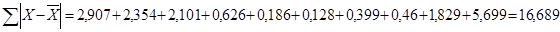 Средняя арифметическая взвешенная не показывает, как распределяется вокруг нее варианты осредненного признака, поэтому рассчитываем показатели вариации, которые характеризуют отклонения значений от общей средней. 1) размах вариации определяется как разность между наибольшим (Xmax ) и наименьшим (Xmin ) значением признака и указывает на общие размеры вариации: R = Xmax – Xmin 2) среднее линейное отклонение – определяется как средняя арифметическая из абсолютных значений отклонений от средней. Так как сумма отклонений значений признака от средней величины равна нулю, то все отклонения берутся по модулю: