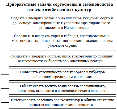Рисунок 1 - Цель и задачи инновационной деятельности В-третьих, необходимо разработать и внедрить в сельскохозяйственных предприятиях эффективные ресурсосберегающие приемы обработки почвы (энерго-, влаго-, трудо- и почвосберегающие технологии. В-четвертых, нужно, наконец, перейти к рационализации антропогенного воздействия на почвенные ресурсы. В-пятых, требуется усовершенствовать приемы и способы применения химических, а также биологических средств повышения плодородия почв, в частности на основе эффективного использования предварительно обогащенных азотными удобрениями пожнивных остатков, соломы, увеличения масштабов применения сидеральных паров. В-шестых, требуется усовершенствовать технологии использования органических удобрений, в большей мере способных предотвратить потери гумуса в почве и даже наращивать его содержание. В-седьмых, остается актуальной задача по усовершенствованию традиционных и разработке новых эффективных технологий использования микробного потенциала агроценозов, от чего плодородие почв зависит в не меньшей мере, чем от применения удобрений. В-восьмых, и, пожалуй, наиболее актуальное направление. Требуется изыскивать и осуществлять меры, обеспечивающие устойчивость агроэкосистем в условиях техногенного земледелия, которое, несомненно, еще длительное время будет оставаться преобладающим. Важными составными элементами систем земледелия являются селекция (выведение новых сортов и гибридов) и семеноводство сельскохозяйственных культур. По имеющимся оценкам, вклад селекции в повышение урожайности важнейших сельскохозяйственных культур может достигать 70 % всей величины прироста. По мнению видных ученых [24, 26], роль селекции и семеноводства и дальше будет постоянно нарастать. Это связано как с общими тенденциями к биологизации и экологизации инновационных процессов в агроэкономике, так и с возросшими возможностями самой селекционной науки в управлении параметрами выращиваемых культур. Указанное явление широко проявилось уже в 1960-х годах, с началом развертывания во многих развитых и развивающихся странах "зеленой революции", в ходе которой решающую роль сыграли именно новые, более урожайные сорта и гибриды. Обобщая направления инновационной деятельности в сортосмене и семеноводстве сельскохозяйственных культур, приоритетные задачи этой сферы можно представить в виде схемы, помещенной на рис.2.