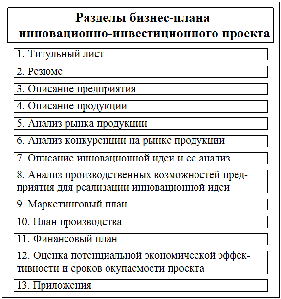 Рисунок 3 - Содержание резюме Важнейшим разделом бизнес-плана является оценка сроков окупаемости и конечной эффективности соответствующих проектов. Об этом речь пойдет в следующем параграфе. 2.3. Методы анализа эффективности инвестиций В экономической литературе описано немало методов анализа эффективности инвестиций, в том числе осуществляемых в сельском хозяйстве [21, 23, 28]. В общем случае экономическую эффективность прямых инвестиций (капиталовложений) определяют путем сопоставления полученного эффекта от их применения с величиной инвестиционных расходов. Прежде всего принято определять коэффициент общей экономической эффективности инвестиций (его называют также капиталоотдачей). Этот коэффициент представляет собой отношение прироста прибыли (чистой продукции, чистого дохода и т.п. показатели) к вызвавшим этот прирост капиталовложениям, т.е. используют формулу: