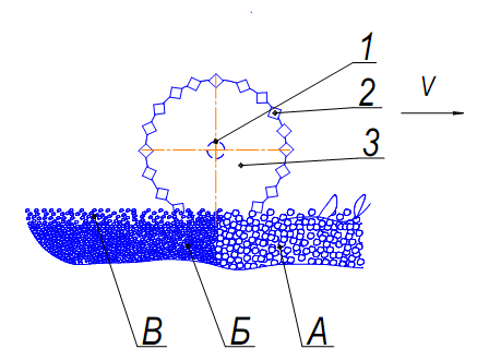 Рисунок 27 – Схема работы катка струнного 1-вал; 2-струна; 3-диск. А –крупноагрегатный слой с растительными остатками; Б – уплотненный капиллярный слой; В – мульчирующий влагосберегающий слой. 9 Описание устройства, процесса работы и регулировок проектируемой машины 9.1 Устройство Модернизированная сеялка для посева зерновых культур бороздково-ленточным способом выполнена на базе серийной сеялки СЗ – 2,8. Модернизация заключается в изменении конструкции сошниковой секции и замене гладкого катка на струнный. Остальные элементы остаются без изменений. Предполагаемая модернизируемая машина предназначена для разноуровневого внесения семян и удобрений, причем удобрения вносятся на 5 – 6 см ниже уровня семян. Технологическая схема сеялки представлена на рисунке 27.