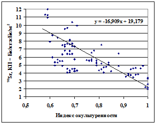 Основные агрохимические показатели почвы определяли по общепринятым методикам: гумус – по Тюрину в модификации ЦИНАО (ГОСТ 26212-91); рН (КСl) – потенциометрическим методом (ГОСТ-26483-85); гидролитическую кислотность – по Каппену (ГОСТ 26212-84); сумму поглощенных оснований – по Каппену-Гильковицу (ГОСТ 27821-88); по-движные формы фосфора и калия – по Кирсанову (ГОСТ 26207-91); обменный кальций и магний – на атомно-абсорбционном спектрофотометре AAS-30 (ГОСТ 26487-85); степень насыщенности почв основаниями и индекс агрохимической окультуренности почв – расчетным методом. Содержание 137 Cs в исследуемых образцах (почва, растения) определяли на γ-спектрометрических комплексах фирм «Canberra» и «Tennelec». Радиохимическое выделение 90 Sr проводили по стандартной методике ЦИНАО с радиометрическим окончанием на аттестованном α-β-счетчике «Canberra-2400». Аппаратурная ошибка измерений не превышала 15-20 %. Для количественной оценки поступления радионуклидов из почвы в растения рассчитывали коэффициенты пропорциональности по следующей формуле: КП = (Бк/кг) : (кБк/м2 ) (1) Все полученные данные подвергали статистической обработке методом дисперсионного и регрессионного анализов c использованием стандартного компьютерного программного обеспечения (Excel 7.0, Statistic 7.0). Результаты и их обсуждение Результаты исследований показали, что самый эффективный способ улучшения пойменного луга – внесение 3 т/га доломитовой муки и минеральных удобрений в дозе N90 P60 K180 в два приёма, за счёт которого удалось добиться самого наибольшего снижения величины перехода радионуклидов (в 4,7 раза 137 Cs и в 2,6 раза 90 Sr) в естественный травостой и дополнительно снизить в 1,7 раза величину перехода 137 Cs и в 1,8 раза 90 Sr по сравнению с базовым вариантом (табл. 2). Содержание радионуклидов в сене изменялось в следующих пределах: 137 Cs – 184–1298 Бк/кг (Кп – 0,21–1,50), 90 Sr – 297–534 Бк/кг (Кп – 4,15–7,47), и могло быть использовано для получения молока с обязательной дальнейшей переработкой [5-8]. Перезалужение пойменного луга с использованием только обработки почвы (дискование и вспашка без внесения доломитовой муки и минеральных удобрений) и создание нового культурного травостоя из многолетних злаковых трав позволило снизить содержание только 137 Cs (в среднем в 1,4–2,8 раза) до 1559–3091 Бк/кг (Кп – 1,81–3,58) – на дисковании и 535–1714 Бк/кг (Кп –0,62–2,0) на вспашке, и увеличить поступление 90 Sr (в среднем в 1,1–1,4 раза) до 851–2056 Бк/кг (Кп –11,91–28,76) – на дисковании и до 528–2241 Бк/кг (Кп – 7,38–31,35) на вспашке по сравнению с величиной перехода радионуклидов в естественный травостой в контроле. Улучшение условий питания многолетних злаковых трав за счёт ежегодного внесения полного минерального удобрения в дозе N90 P60 K120 в два приёма после дискования и вспашки (табл. 2) обеспечило дальнейший рост их урожайности и дальнейшее снижение перехода радионуклидов (в 2,8–4,8 раза 137 Cs и в 1,7–2,6 раза 90 Sr) по сравнению с контрольным вариантом. В полученном сене содержалось в среднем: в варианте 8 – 731–1314 Бк/кг 137 Cs (Кп – 7,1–9,9) и 303–555 Бк/кг90 Sr (Кп – 6,58–12,05), в варианте 13 – 259–849 Бк/кг 137 Cs (Кп – 0,30–0,98) и 360–392 Бк/кг 90 Sr (Кп – 5,03–5,49), что могло быть использовано только для производства молока с обязательной переработкой в другие молочные продукты. Внесение 3 т/га доломитовой муки и полного минерального удобрения N90 P60 K120 в два приёма под дискование и вспашку обеспечило дальнейшее снижени