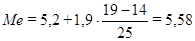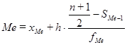 Медиана соответствует варианту, стоящему в середине ранжированного ряда. Положение медианы определяется ее номером. Медианным является первый интервал, в котором сумма накопленных частот превысит половину общего числа наблюдений. Численное значение медианы определяется по формуле:
