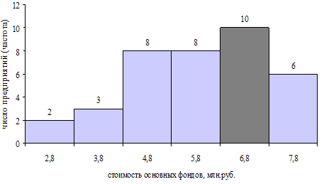 Рис. 1 Распределение приборостроительных предприятий по стоимости основных фондов Анализируя диаграмму на рис.1, видно, что в рассматриваемой совокупности приборостроительных предприятий Челябинской области наиболее часто встречаются предприятия со стоимостью основных фондов 6,63 млн. руб. Величина медианы свидетельствует о том, что 50% предприятий имеют основных фондов на сумму 6,05 млн. руб. Построим график кумуляты по данным таблицы 2.