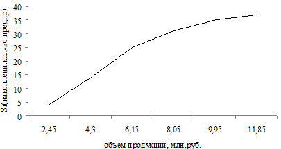 Рис.3 Распределение приборостроительных предприятий по объему продукции Анализируя диаграмму на рис.3, видно, что в рассматриваемой совокупности приборостроительных предприятий Челябинской области наиболее часто встречаются предприятия с объемом выпускаемой продукции на 5,52 млн. руб. Величина медианы свидетельствует о том, что 50% предприятий имеют объем продукции на сумму 5,58 млн. руб. Построим график кумуляты по данным таблицы 3.