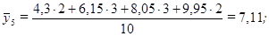 Модальный интервал (см. табл.2) - пятый (6,3-7,3], т.к он имеет наибольшую частоту (10). Медианный интервал - четвертый (5,3-6,3], т.к это первый интервал, в котором величина накопленных частот больше