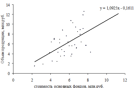 Графически такая зависимость объема продукции от стоимости основных фондов может быть представлена с помощью поля корреляции, изображенного на рис.3.