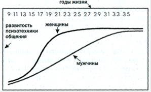 Рис.9 Ну и что из того? А вот что... Девушка приятна для своих ровесников и ровесников ее мужа. И они проявляют к ней повышенный интерес и... повышенную покладистость (они же не в браке с ней) и тоже кажутся ей лучше. Но к ней тянут свои нежные взгляды и ласковые руки и мужчины постарше - матерые, статусные, денежные, со связями, с опытом, много повидавшие, умеющие об увиденном поведать, решившие проклятую квартирную проблему. А они более конкурентоспособны на "рынке любви" по сравнению с ее ровесниками. И даже те, кто серьезно старше... Некоторые из них добились такого высокого положения в жизни, что "с тобой на плаху, если так"... Так что ее более высокая по сравнению с мужем сексапильность для людей противоположного пола обеспечивает ей больший успех по сравнению с мужем. МОЛОДАЯ ЖЕНА СКОРЕЕ НАЙДЕТ ЗАМЕНУ МОЛОДОМУ МУЖУ, ЧЕМ МОЛОДОЙ МУЖ НАЙДЕТ ЗАМЕНУ ЕЙ. И молодой муж боится развода и сопротивляется ему. Итак, еще продвинулись от 50/50 к 68/32. ПРИЧИНА №4 Здесь обойдемся без "сократического" диалога, потому что наблюдения у непрофессионалов здесь менее точные. Но они зато есть у психологов, чьи наблюдения важны для дальнейших рассуждений. У МОЛОДОЙ ЖЕНЫ ЛУЧШЕ ПСИХОТЕХНИКА ОБЩЕНИЯ, ЧЕМ У МОЛОДОГО МУЖА. Обратите внимание, как бойко щебечут девочки-подростки. "Талант! Талант!" А их ровесники-мальчики говорят разве что междометиями (ну, это легкое преувеличение, но для иллюстрации оно годится). Правда, ближе к свадьбе молодой человек разговаривает уже простыми предложениями. А вот тридцатилетний его соперник изъясняется сложносочиненными и даже сложноподчиненными предложениями, употребляя часто не только причастные, но и деепричастные обороты, а к ласкам и сказки прибавит, что к ее шелковой коже так идет его бархатный голос. К чему это? А к тому, что при разрыве у нее больше возможностей замены в том числе и благодаря более развитой психотехнике общения. Например, чтобы познакомиться, ей достаточно игривого взгляда, и за ней вприпрыжку побегут более престижные ухажеры. Она и ухаживания принимает красиво, а молодой муж и ухаживает, неуклюже. В технике знакомства молодой муж проигрывает не только ей, но и старшим своим соперникам. Напускная развязность молодых мужчин и подростков - как раз от неумения общаться, она являет собой неуклюжую гиперкомпенсацию этого неумения. Вот как приблизительно выглядит развитие психотехники общения у женщин (черная кривая) и у мужчин (серая кривая).