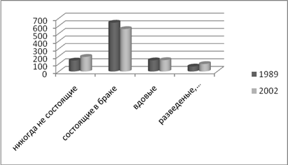 Снижение коэффициента брачности мы наблюдаем почти во всех странах. Но в России и еще двух странах: Белоруссии и Казахстане он все же высок. Россия, не смотря на идеологию молодежи, все еще семейная страна, но разводы однако имеют место быть. По Псковской области в1994 году зарегистрировано 5728 браков и 4334 развода, в 2000 году – 4591 брак и 3279 разводов, в 2003 году – 5485 браков и 3613 разводов, в 2007 году – 5901 брак и 3112 разводов. Данные цифры свидетельствуют о том, что понятие целостной родовой семьи с годами утрачивается, идеология общества и ценности меняются , традиции уже не имеют былого значения, общество стало более свободным . Коэффициент брачности по области составляет 8,3 , что превышает показатель в целом по России. Изменение брачной структуры населения по данным переписей можно графически изобразить в виде диаграммы (см. Приложение №8). По сравнению с 1989 годом количество «никогда несостоящих в браке» и «разведенных» увеличилось, а вот количество «вдовых» осталось почти без изменений. Весьма интересные факты по социальной структуре российского общества были получены при использовании сети Интернет: