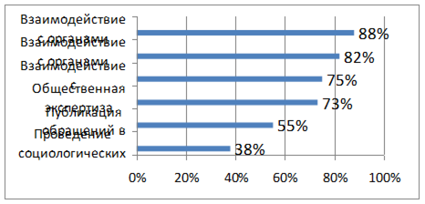 Рис. 23. Основные направления деятельности региональных общественных палат Региональные общественные палаты осуществляют постоянный контакт с органами государственного и муниципального управления, упрочивают контакты с НКО, проводят собственные социологические исследования, публичные обсуждения, связанные с совершенствованием законодательства, повышением занятости населения, переподготовкой кадров, толерантностью, экологией, жилищными проблемами, а также рассматривают вопросы, затрагивающие интересы детей, пенсионеров и сельских жителей. Общественные палаты стали приглашать на свои заседания и слушания, включая выездные, руководителей (представителей) органов государственной власти, а также направлять запросы во властные структуры с целью получения достоверной информации по различным вопросам. Несомненной проблемой является то, что собираемые в результате проведенных мониторингов данные о социально-экономической ситуации и состоянии гражданского общества в регионах не используются властью в надлежащей степени. Региональные общественные палаты стали уже важным, нередко единственным средством общения НКО с властью и возможностью реализации функции гражданского контроля. К сожалению, в ряде субъектов РФ, в том числе, в Карачаево-Черкесской Республике, Приморском и Ставропольском краях, Владимирской области, Еврейской автономной области под предлогом отсутствия денежных средств в местных бюджетах не принимаются законы об общественных палатах. В некоторых субъектах РФ, например, Республике Адыгея и Республике Хакасия, палаты номинально созданы, но не финансируются. Отказ правительства Москвы от формирования общественной палаты под тем предлогом, что при нем уже есть Общественный совет, несмотря на множество обращений от НКО, явно не способствует популяризации поддержки общественных палат в регионах. В соответствии с постановлением Правительства Российской Федерации от 2 августа 2005 года № 481 и указом Президента Российской Федерации от 4 августа 2006 года № 842, при федеральных органах исполнительной власти с 2006 года образуются общественные советы. В настоящее время советы сформированы при 42 министерствах и ведомствах. Право образования общественных советов при министерствах и ведомствах, а также активное участие в их работе явились для Общественной палаты Российской Федерации еще одной возможностью реализовать функцию общественного контроля над деятельностью федеральных органов исполнительной власти, органов исполнительной власти субъектов Российской Федерации и органов местного самоуправления. В состав советов входят 63 действующих члена Общественной палаты, представители общественных организаций, в том числе правозащитных, журналисты, известные деятели искусств, что предполагает непредвзятость их рекомендаций. Заседания общественных советов планируются и проводятся, как правило, не реже 1 раза в квартал. Разумеется, динамично изменяющаяся ситуация в экономической и общественно-социальной жизни страны требует гораздо более оперативной реакции и принятия мер. Если классифицировать тематику заседаний советов, то можно выделить среди них три значимых группы: 1. Вопросы, связанные с рассмотрением актуальных проблем. Например, общественные советы при Министерстве внутренних дел Российс