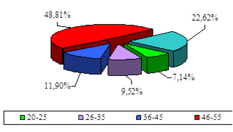 Рисунок 1. Структура сотрудников специализированной коррекционной школы-интерната по возрасту По данным рисунка 1 видно, что сотрудники школы-интерната для глухих детей в возрасте старше 46 лет (предпенсионного и пенсионного возраста) более 70% (71,43%). Молодые сотрудники и специалисты в структуре персонала составляют всего 7,14%. Данные анкетного опроса показали, что среди работников специализированной школы-интерната № 4, преобладают специалисты с высшим образованием (66,67%).