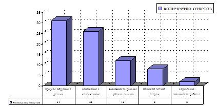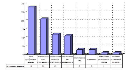 Рисунок 8. Распределение ответов на вопрос «Что Вам нравится в процессе профессиональной деятельности?» Далее ответы по значимости распределились следующим образом: · Возможность уйти раньше на пенсию · Большой летний отпуск · Социальная значимость работы Респонденты имели возможность отметить два существенных для них ответа, поэтому число ответов больше числа анкетируемых. Ответы сотрудников специализированной коррекционной школы-интерната на вопрос «Что не нравится в процессе профессиональной деятельности?» показали, что больше всего их волнует низкая заработная плата и отсутствие компенсационного (бонусного) пакета. Ответы распределились следующим образом: 1. Низкая заработная плата - 40 чел. 2. Отсутствие компенсационного пакета - 26 чел. 3. Большая загруженность, мало свободного времени – 12 чел. 4. Отношения с коллективом сотрудников – 1 чел. 5. Другое (Трудно добираться на работу) – 1 чел. При анализе ответов анкеты выяснилось, что наиболее важными факторами в процессе деятельности для сотрудников школы-интерната являются сама профессиональная деятельность и межличностные отношения с детьми (рисунок 9). По значимости ответы распределились следующим образом: 1. Сама профессиональная деятельность - 35,0% 2. Межличностные отношения с детьми - 26,25% 3. Достижения знаний и профессионализма – 15,0% 4. Межличностные отношения с сотрудниками – 13,75% 5. Ответственность – 3,75% 6. Признание - 3,75% 7. Повышение социального статуса – 1,25% 8. Механизм социальной помощи – 1,25%