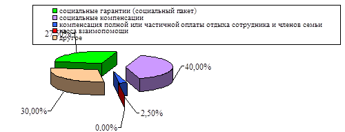 Рисунок 9. Распределение ответов на вопрос «Что Вам нравится в процессе профессиональной деятельности?» Анализ данных анкеты показывает, что механизм социальной помощи, как составляющая социальной политики в бюджетной организации, в качестве ответа был отмечен только в одном ответе. При выборе ответа на вопрос анкеты «В чем заключается социальная политика в вашей организации?» респонденты оказались в затруднительном положении и в качестве наиболее частого ответа дописали: «такой нет». Остальные ответы распределились следующим образом (рисунок 10):