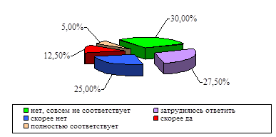 Рисунок 10. Распределение ответов на вопрос «В чем заключается социальная политика в вашей организации?» Анализ результатов анкетирования показал, что 30,0% респондентов не считают социальный пакет с отчислениями в пенсионный фонд и социальные компенсации (в виде сокращения пенсионного возраста и дополнительного отпуска) в качестве составляющей социальной политики организации. Это совершенно верно, так как это гарантировано на федеральном уровне. Оказалось, что 30,0% работников школы-интерната в ответе «Другое» написали: «у нас, ее нет». Ни один респондент не отметил в качестве ответа кассу взаимопомощи, что является странным, так как это один из механизмов социальной политики на уровне организации (беспроцентная ссуда), которую можно осуществит собственными силами. Анализ ответов на вопрос анкеты «Соответствует ли социальная политика Вашей организации представлениям о ней?», показал, что наиболее часто встречаются: · нет, совсем не соответствует 12 чел. (30,0%) · затрудняюсь ответить - 11 чел. (27,5%) · скорее, нет - 10 чел. (25,0%)