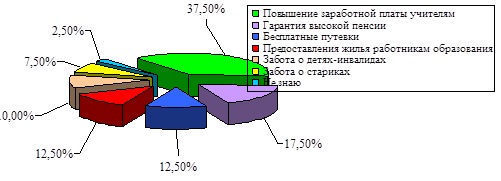 Рисунок 16. Распределение ответов на вопрос «Удовлетворены ли Вы социальной политикой государства в отношении работников бюджетной сферы?» Анализ распределения ответов показал, что более ¾ работников специализированной коррекционной школы-интерната не удовлетворены социальной политикой государства в отношении работников бюджетной сферы. Только 7,5% респондентов ответили утвердительно на вопрос анкеты. 2.3 Основные выводы и рекомендации по результатам исследования особенностей социальной политики в специализированных коррекционных школах-интернатахРеализация социальных прав граждан - одна из наиболее сложных проблем современной России. Одна третья часть населения живет либо на грани, либо за чертой бедности. К этой категории можно отнести и работников образования. Работники бюджетной сферы в силу объективной нуждаемости вправе претендовать на направление социальной политики Российского государства в виде предоставления заботы со стороны общества, всего социального коллектива. Как показали результаты эмпирического исследования, проведенного на базе специализированной коррекционной школы-интерната № 4, такая забота является социальной потребностью работников бюджетной сферы. Анализ ответов анкетирования показал, что, несмотря на то, что большинство работников специализированной коррекционной школы-интерната для глухих детей, работают по призванию, полностью отдают себя избранной профессии, они неудовлетворенны социальной политикой, как на государственном, так и на организационном уровне. Анализ ответов анкеты, позволяет сделать вывод, что работники специализированной коррекционной школы-интерната, практически не интересуются механизмами осуществления социальной политики, как на государственном, так и на организационном уровне. Это связанно у большинства с необходимостью выживания в современных условиях. Труд учителя и воспитателя социально значим, однако, их современное экономическое положение показывает, что для государства это не так. Декларируя на государственном уровне важность качества образования для дальнейшего экономического роста Российской Федерации, государство должно, в первую очередь, думать о престиже учительской профессии и их экономическом положении. Среди различных факторов, влияющих на социальное положение учителей, особое внимание должно уделяться заработной плате, поскольку в современных условиях другие факторы, такие как, положение в обществе, уважение к их профессии, в значительной степени зависят, как и в отношении других подобных профессий, от их экономического положения. Поэтому заработная плата учителей воспитателей как работников бюджетной сферы, должна: С 1 сентября 2007 года осуществлен переход 744 образовательных учреждений в Самарской области на систему оплаты труда работников государственных и муниципальных общеобразовательных учреждений Самарской области, отличную от Единой тарифной сетки по оплате труда работников государственных учреждений Самарской области. Однако в Самарскую Губернскую Думу неоднократно поступали обращения от работников государственных и муниципальных общеобразовательных учреждений о том, что на практике не произошло ожидаемого увеличения заработной платы учителей. Практическое применение методики расчета заработной пла