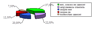 Рисунок 12. Распределение ответов на вопрос «Что, по Вашему мнению, должно входить в социальную политику государства?» Наиболее чаще встречаются ответы «Повышение заработной платы учителям» (37,5%). Вторым по значению для сотрудников школы-интерната оказались «Гарантии высокой пенсии» (17,5%). Это понятно, так как многие из них находятся в предпенсионном возрасте, и их беспокоит прогнозируемая бедность в старости. Многие из сотрудников специализированной коррекционной школы-интерната посвятили свою жизнь работе, не создав семьи. Интересными оказались ответы респондентов на вопрос «Считаете ли Вы, что от вас и сотрудников организации зависит социальная политика организации?».