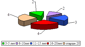 Рисунок 13. Распределение ответов на вопрос «Считаете ли Вы, что от вас и сотрудников организации зависит социальная политика организации?» Ответы распределились следующим образом: 1) нет, совсем не зависит - ответили 15 чел. (37,5%) 2) затрудняюсь ответить - ответили 9 чел. (22,5%) 3) скорее, нет - ответили 8 чел. (20,0%) 4) скорее, да - 5 чел. (12,5%) Только два человека (7,5%) из числа анкетируемых считают, что социальная политика организации полностью зависит от них. Ответы анкетируемых на вопрос «Есть ли у Вас дети, укажите их возраст», распределились, как показано на рисунке 14.