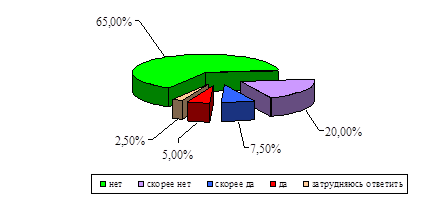 Рисунок 15. Распределение ответов на вопрос «Удовлетворены ли Вы социальной политикой государства в отношении поддержки семей с детьми?» Анализ данных рисунков 14 и 15 показывает, что, несмотря на то, что только у 37,5% анкетируемых есть дети, 65,0% респондентов ответили, что неудовлетворенны социальной политикой государства в отношении поддержки семей с детьми. Респонденты, кто удовлетворительно ответил на этот вопрос (5,0%), все не имеют детей.