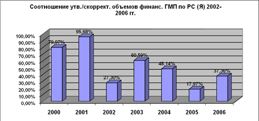 Диаграмма 1 Данные диаграммы свидетельствуют о довольно поверхностном подходе к вопросу финансирования мероприятий молодежной политики со стороны республиканской власти. Практика показывает, что хотя Правительством и Государственным Собранием республики вначале и принимались объемные параметры финансирования из средств республиканского бюджета, но впоследствии укоренилась практика сокращения расходов на молодежную политику. Как видно из диаграммы 2, в некоторые годы финансирование данного раздела государственного бюджета республики сокращалось до 18% от утвержденных ранее этими же институтами государственной власти объемов.
