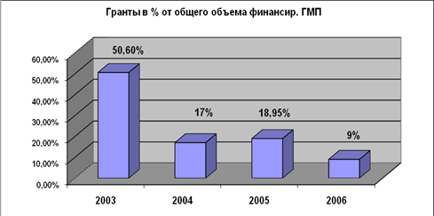 Диаграмма 4 К сожалению, в связи с объективными трудностями в последующем суммы финансирования грантов были существенно урезаны. Но, тем не менее, данные конкурсы остаются одним главных инструментов финансовой поддержки молодежных общественных объединений.