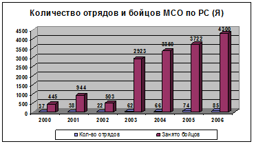 Диаграмма 10 Здесь надо учесть, что финансирование данной подпрограммы в 2006 году шло из федерального бюджета через Департамент федеральной государственной службы занятости населения по Республике Саха (Якутия). Продолжена работа по содействию занятости молодых граждан. По результатам вышеупомянутых социологических опросов была выявлена большая потребность в студенческой среде в организации летнего отдыха и трудовой деятельности. И необходимо было придать новый импульс движению студенческих отрядов, которое было поддержано руководством республики и учебных заведений. Были приняты ряд нормативных актов, проведены рабочие встречи с ветеранами молодежных студенческих строительных отрядов и представителями министерств, высших учебных заведений, предприятий и организаций, проведена работа по созданию штабов молодежных студенческих строительных отрядов в учебных заведениях. Среди которых необходимо отметить Постановление Правительства Республики Саха (Якутия) 27 марта 2003 года №162 «Об организации деятельности молодежных студенческих строительных отрядов в Республике Саха (Якутия)», Распоряжение Правительства Республики Саха (Якутия) № 650-р от 10 июня 2003 года «Об организации деятельности молодежных студенческих строительных отрядов в 2003 году» № 650-р от 10 июня 2003 годаи другие. И уже по итогам летнего трудового сезона 2003 года количество студенческих отрядов возросло почти в 3 раза, а привлеченных студентов и молодежи почти в 6 раз по сравнению с показателями 2002 года, а объемы выполненных бойцами студенческих отрядов работ превысили 30 млн. рублей. В начале 2004 года по инициативе студентов и молодежи было учреждено Общественное движение «Молодежные студенческие отряды» - молодые люди поверили в свои силы, в возможность приобретения умения и навыков хозяйственной деятельности и поправить материальное положение во время каникул. И даже после того, как при корректировке государственного бюджета республики в 2005 году на финансирование подпрограммы по развитию деятельности молодежных студенческих отрядов не было выделено ни одного рубля, динамика поступательного развития их деятельности не претерпело изменений. Так, в 2005 году работало 74 студенческих отрядов, в которых было задействовано более 3,7 тысяч юношей и девушек, а объемы выполненных работ составили более 83 млн. рублей. В 2006 году охват движения еще более увеличился и составил уже 85 отрядов с 4300 бойцами.