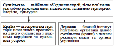 Крім поняття суспільство, виникають та використовуються поняття держава, країна. Ці поняття близькі між собою, але їх неможливо ототожнювати, оскільки вони мають і свої специфічні характеристики (див. схему 3). Схема 3