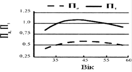 Рис.2. Залежність показників поширеності цінностей Рвз та їх роль П відкваліфікації (а) й активності (б) На цінності людини чималий вплив здійснює її вік. Високі цінності особистісного розвитку зазвичай на початку життя зростають, досягають максимуму, а потім тією чи іншою мірою знижуються (рис. 3). Так, для викладачів вузів цей максимум відповідав 45 рокам. Важливо встановити, наскільки стійке значення показників ролі високих цінностей стосовно зовнішніх факторів. Є дані, що в зв'язку із зміною ладу і типу економічних відносин, духовною кризою в країнах, які раніше входили до складу СРСР, роль альтруїстських цінностей у свідомості людей різко впала. Діаграми побудовані на основі даних В. Травіна та В. Дятлова [93].