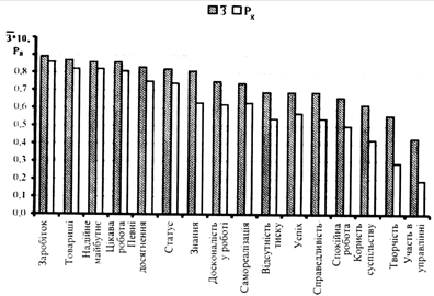 Рис. 1. Ієрархія життєвих цінностей професорсько-викладацького складу Для зазначених респондентів великою є роль пізнання як такого (можливість навчання, розширення свого світогляду, загальної культури, інтелектуального рівня). Це свідчить про те, що професорсько-викладацький склад усвідомлено орієнтується на високі цінності і за своїми духовними потенціями відповідає своєму призначенню — підготовці фахівців-інтелігентів. Важливо, що, незважаючи на скрутний матеріальний стан багатьох співробітників вузів, матеріальний достаток як життєва цінність не потрапив у трійку найбільш значимих для респондентів. Тому помилковою є думка деяких керівників (вона відповідає західному рівню менеджменту початку XX століття, концепції тейлоризму) про те, що єдиним головним інструментом керування є зарплата, матеріальна винагорода. Цей погляд руйнує особистість і основи національного менталітету. Серед життєвих цінностей із працею викладачів найбільш тісно пов'язані три такі: пізнання, власне робота і самореалізація. Менша роль власне роботи у порівнянні з пізнанням пояснюється тим, що у свідомості людини поняття "робота" поєднує не тільки позитивні фактори. Взагалі "пізнання" є більш абстрактним поняттям. Воно ближче до ідеалу. "Робота", навпаки, є ближчою до існуючої конкретності, яка не може бути кращою за ідеал. Ще менша роль "самореалізації" (ранг 6-7) є негативною стороною виявлених ціннісних орієнтацій особливо для такої категорії респондентів, як професорсько-викладацький склад вузу. Вона частково пов'язана з недостатньо розвинутою рефлексією, з відсутністю звички самоаналізу, належного прагнення до самовдосконалення. Якщо вважати, що мотиваційній групі "трудоцентриста" найкраще відповідає цінність "робота", то показник ролі трудоцентристських цінностей Пт для викладачів вузу буде дорівнювати 0,91, що є високим значенням і позитивно характеризує респондентів. Декілька слів варто сказати про цінності, оцінені як найменш значимі. Серед них ранг 9 — щастя людей, добробут суспільства. Низька роль альтруїстських цінностей, які належать до групи соціоцентристських, сформульованих у анкеті у такому загальному вигляді, буде обговорюватися надалі і не є особливістю ціннісних орієнтацій викладачів. Дозвілля — "розкоші", яких одні респонденти не можуть собі дозволити через брак часу і духовної енергії, а інші просто не вважають їх важливими, тому що, як говорив Ж.Ж. Руссо, вони "зосереджені на іншому". На перший погляд духовне життя, релігія мають занадто низьку значимість. Духовність є ідеальною потребою у сприйнятті ідей, знань, художніх цінностей, вона відносно незалежна від прагматичних цілей [61]. Без духовності немає ефективного духовного виробництва. Тому духовність є важливим фактором розвитку культури, а формування духовних потреб — найважливішою задачею виховання. Низька суб'єктивна оцінка певною мірою може бути пояснена тими ж причинами, що і занижена оцінка "самореалізації". Більшість викладачів сформували свою особистість за соціалістичного ладу, коли вся увага приділялася колективу, суспільству в цілому, тобто світу зовнішньому стосовно людини, але не індивідуальності, внутрішньому світу, що призвело до ослаблення прихильності вітчизняної інтелігенції до духовних пошуків. Але якщо ми хочемо мати інновації, культи