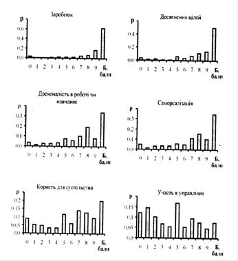 Рис. 4. Трудові цінності студентів вузу 2-е місце мають товариші, можливість спілкування, особливо важлива для людей студентського віку. 3-е місце має надійне майбутнє, що пов'язано з труднощями влаштування на роботу. Важливість цієї цінності зросла серед молоді навіть за останні 3 роки. 4-е місце займає цікава робота, взагалі робота і навчання як такі. Таке розташування найбільш важливих цінностей приблизно відповідає результату, отриманому при аналізі трудових цінностей працюючого населення 34 країн світу [49]. Приємно зазначити, що для студентів велике значення має можливість досягнення цілей. Ця цінність займає 5-е місце, а показник її ролі щодо заробітку досить великий (Пд =0,85). Це говорить про активність молоді, високий динамізм її мотиваційної сфери, її спрямованість у майбутнє. Досконалість у роботі і самореалізація знаходяться посередині списку цінностей. Відповідно показники їх ролі рівнюють: Пдр =0,7 Псо =0,72. Істотно впало навіть у порівнянні з даними опитування студентів у 1998 р. значення альтруїстських цінностей, зокрема "користі праці для суспільства". Показник ролі вказаної цінності Пк =0,48. Про причини такого зрушення ціннісних орієнтацій вже говорилося. Проте таке явище слід вважати тривожним сигналом, який свідчить про негативну деформацію суспільної свідомості молоді. Він створить серйозні перешкоди на шляху розвитку високої корпоративної культури. Останнє місце у списку цінностей займає "можливість участі в управлінні організацією". Але все-таки число студентів, для яких ця цінність є високозначимою, складає 19% від загальної кількості студентів. Поряд з іншими причинами це говорить про те, що чимало студентів хотіли б безпосередньо займатися управлінською, організаційною діяльністю, бути менеджерами. Достатня величина вибірки дає можливість дослідити розподіл цінностей. Так, на рис. 3.5 подані приклади цих розподілів у виді гістограми, причому на осі абсцис відкладена значимість цінностей у балах, а на осі ординат — частота, тобто відносне число респондентів. Через те що 15 цінностей є по суті позитивними, то для них розподіли мають правосторонню асиметрію, тобто є тенденція до зростання числа респондентів, які вважають цінності високозначи-мими. Особливо сильною ця тенденція є для цінностей, які займають перші п'ять місць у списку (з них на малюнку показані розподіли для заробітку і прагнення до досягнення цілей). Для них розсіювання оцінок мале (коефіцієнт варіації значимостей не перевищує 0,25-0,3). Для "участі в управлінні" асиметрія є лівосторонньою, тобто для більшості респондентів ця цінність малозначима. Для більшої частини розподілів, починаючи з 3-го місця в списку (наприклад, для цінності "користь для суспільства") з'являється локальний максимум у середині переліку цінностей при 5, а іноді й 7-8 балах. Це означає, що значна частина студентів (для цінності "користь для суспільства" — 45%) вважає ці цінності важливими, але не визначальними для їхньої ціннісної орієнтації. Для цінності "творчість" локальний максимум при 5 балах одночасно є і глобальним максимумом, тобто, багато студентів вважає, що можливість творчості не є визначальним фактором, але це деяка норма, без якої не можлива робота сучасної людини. По розподілах цінностей можна оцінити частку респондентів для різних значень ВЗ, наприклад 8,9 або 10 балів.