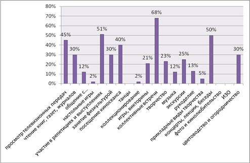 Ряд вопросов к респондентам был направлен на выяснение места интерактивных технологий в структуре специально организованного и самостоятельного досуга. Требовалось выбрать ответ из 20 предложенных примерных вариантов досуговых занятий. Полученные результаты свидетельствовали о том, что важнейшими формами досуга для пожилых людей, проживающих в стационарных учреждения социального обслуживания, является просмотр телепередач, кинофильмов, посещение концертов. На остальные занятия в среднем расходуется времени меньше. Ответы продемонстрировали большой разброс в досуговых предпочтениях, что свидетельствует о том, что значительная часть проживающих в доме-интернате пожилых людей изначально ориентируется на интегрирование в нормальную социокультурную жизнь. Они охотно готовы вступить в контакт с организаторами досуговых мероприятий и принимают условия задаваемые, интерактивными технологиями (в первую очередь это касается репетиционной и исполнительской деятельности, различных видов прикладного творчества, цветоводства, общения с друзьями). При этом они не просто следуют предполагаемым образцам действий и «правилам игры», но склонны проявить определенную инициативу, связанную с закреплением имеющихся умений, навыков или перенесением их в другие ситуации. 4. Какие коллективные формы досуга пользуются наибольшей популярностью среди проживающих?