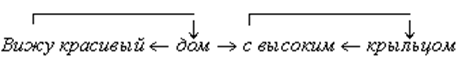 Из двух слов, непосредственно связанных синтаксической зависимостью, одно называется главным, или вершиной (на диаграмме из него выходит стрелка), а другое – зависимым (в него стрелка входит). Другой способ синтаксического анализа заключается в последовательном разделении предложения на все более мелкие единицы, состоящие из наиболее тесно связанных между собой слов. Такие грамматически слитные отрезки называются составляющими. Структура составляющих может быть изображена, например, с помощью скобок: вижу красивый дом с высоким крыльцом. С помощью скобок обозначен тот факт, что все предложение в целом, а также такие его части, как дом с высоким крыльцом, с высоким крыльцом, высоким крыльцом, являются составляющими. Как структура зависимостей, так и структура составляющих определяется на основе аналитических критериев, главным из которых является контекстное распределение, или дистрибуция синтаксических единиц. Так, например, тот факт, что вижу является вершиной по отношению к дом, ясен из того, что контексты, в которых может быть употреблено словосочетание вижу дом, совпадают с контекстами, в которых можно употребить вижу, но не с контекстами, в которых может появиться дом (ср. грамматически правильные предложения Я хорошо вижу дом, Я хорошо вижу и Джек построил дом с грамматически неправильным, на что указывает звездочка в начале, выражением *Джек построил вижу дом). То, что, например, красивый дом с высоким крыльцом – грамматически слитная единица (составляющая), видно, в частности, из того, что она может быть целиком заменена на местоимение: вижу его. Основное теоретическое предположение, лежащее в основе синтаксического анализа, заключается в том, что связи между элементами предложения (неважно, описывается ли его структура с помощью понятия синтаксической зависимости или с привлечением представления о синтаксических составляющих) строго ограничены. При графическом изображении на плоскости (рис. 1, 2) в виде множества точек-узлов, соответствующих словам или составляющим, структура зависимостей и структура составляющих для большинства предложений образуют дерево – ориентированный граф, в котором в каждый узел, кроме единственного корневого, входит ровно одна стрелка (принцип единственности вершины) и в котором нет замкнутых путей (принцип запрета на контур):