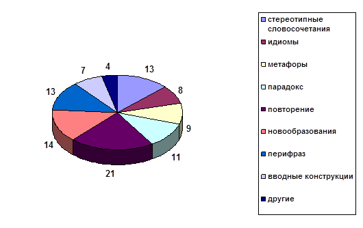 В рассказе «TheGreatPancakeRecord» byOwenJohnson автор часто использует иронию: “Afinefootballteamwe’ll have” [45; 104]. Это ироническое восклицание, потому что в начале рассказа автор пишет о мальчишке, который весил всего около 48 килограмм и никогда не играл ни в футбол, ни в бейсбол: «He was “a dead loss”, good for nothing but …» [45; 105]. Мы вполне можем перевести следующую фразу как «Ну еще бы»: “Yes, youare” [45; 103]. Автор использует сатиру для того, чтобы показать превосходство учащихся над новичками. Эта фраза была произнесена для того, чтобы показать, что участие в игре в их команде – это должно быть большой честью для всех новичков. В рассказе «TheStory-Teller» byH. Munro используются вводные конструкции и парадоксы. “At any rate I kept them quiet for 10 minutes, which was more than you were able to do” [43; 29]. Автор использует сатиру, потому что хочет показать, что тетя детей не может их успокоить своими рассказами, а рассказчику удалось заставить их посидеть тихо во время его рассказа. На уровне предложения авторы часто используют смешение стилей речи: “Thirty-two is a long way to go,” said Conover, looking apprehensively at the little David, “fourteen pancakes is an awful lot” [45; 111] Давид – это библейский герой, который победил Голиафа, а Джонни Смид просто побил «рекорд» своих предшественников. 3.4 Реализация способов и приемов выражения комического на уровне словосочетания Проанализировав некоторые рассказы современных англоязычных авторов, мы пришли к выводу, что данный уровень употребляется наиболее редко. На данном уровне преобладающими приемами являются стереотипные словосочетания и вводные конструкции [см. ДИАГРАММУ 7]. Диаграмма 7. Приемы использования комического на уровне словосочетания